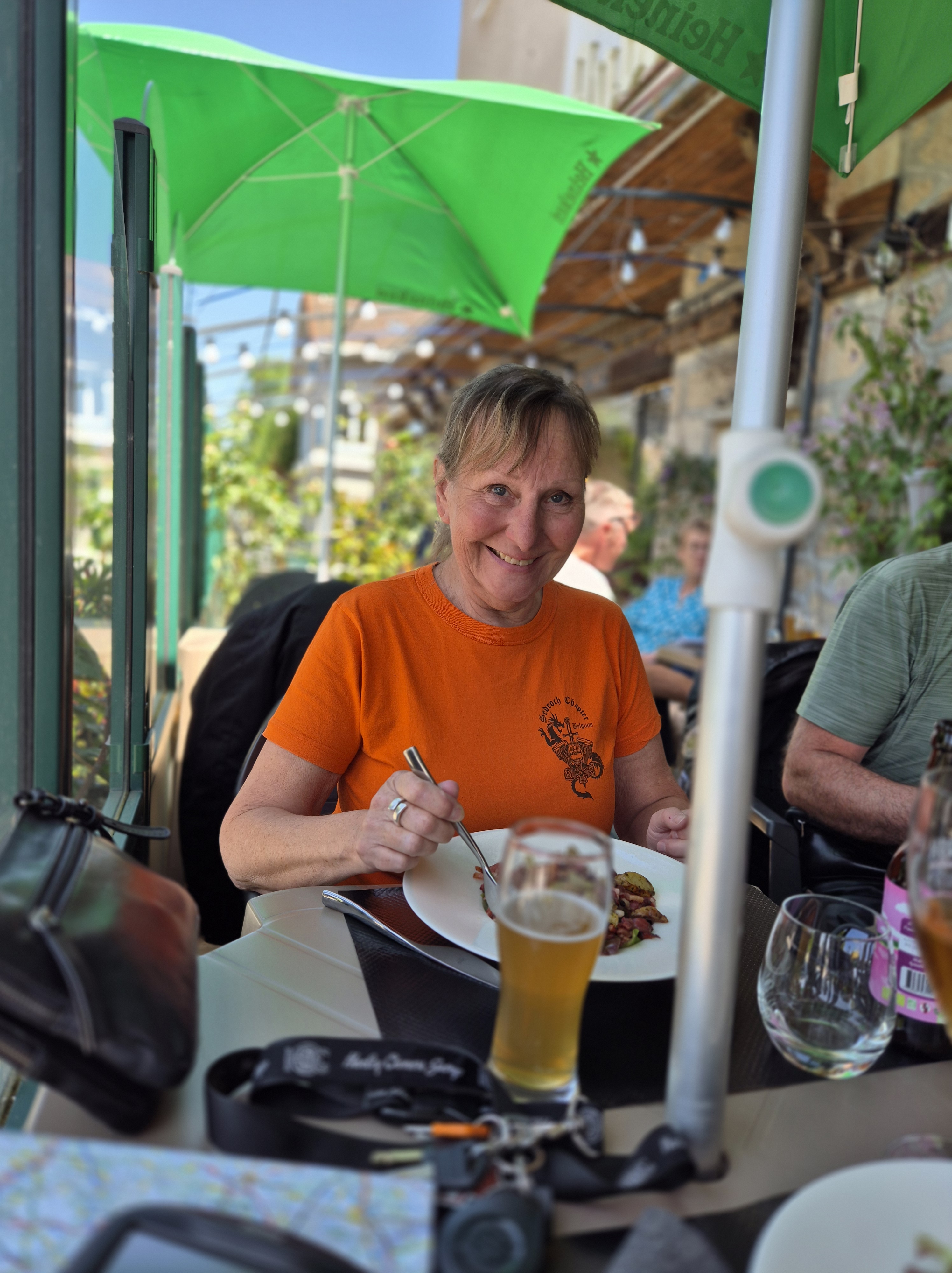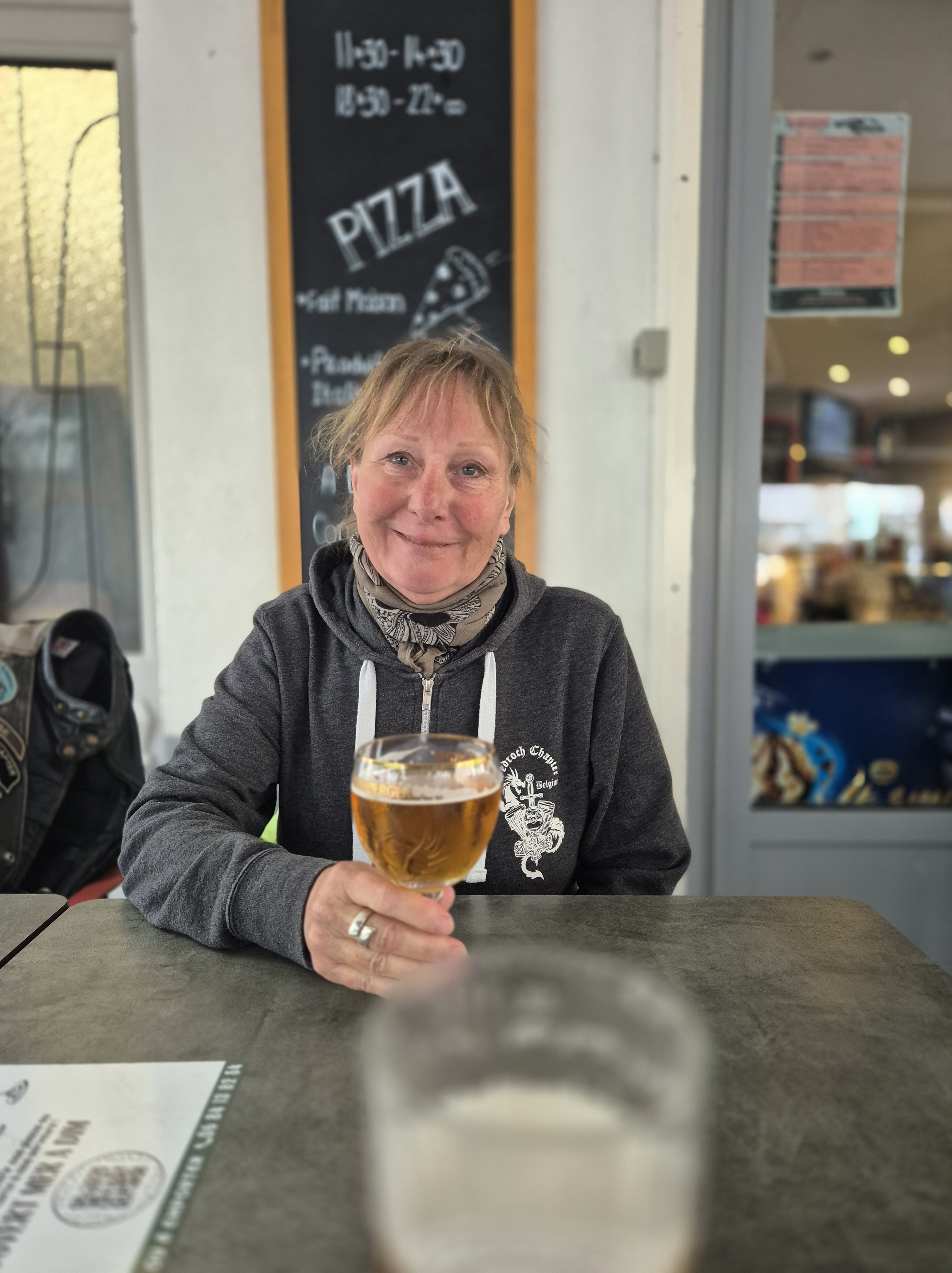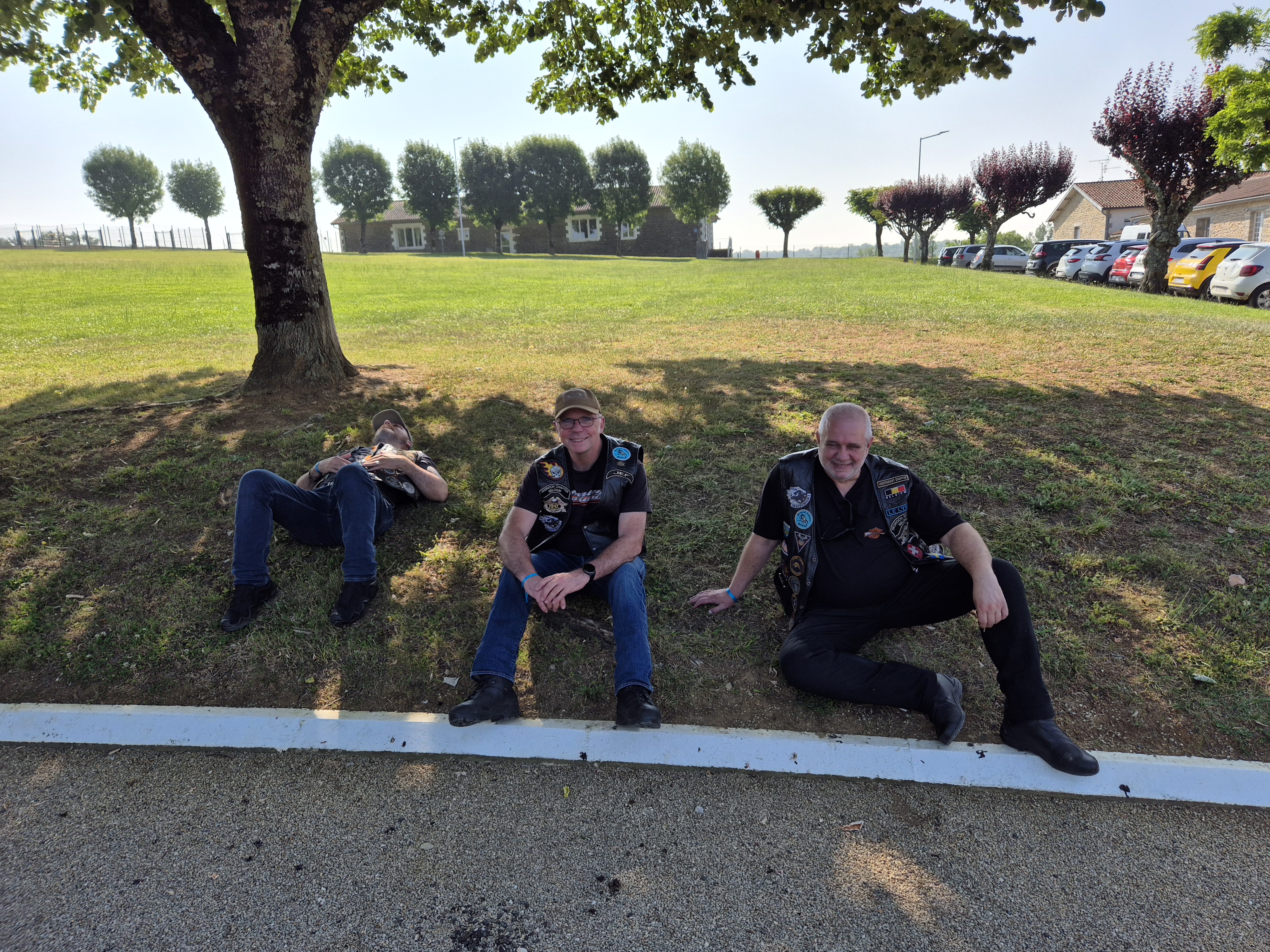 Jef se dévouera pour aller nous chercher quelques pizzas en ville (pratique le Tour Pack du CVO d’Emile) qu’on partagera à même la pelouse, le maître (GIMS) des lieux nous refusant l’installation aux tables intérieures vu qu’il s’apprête à fermer…