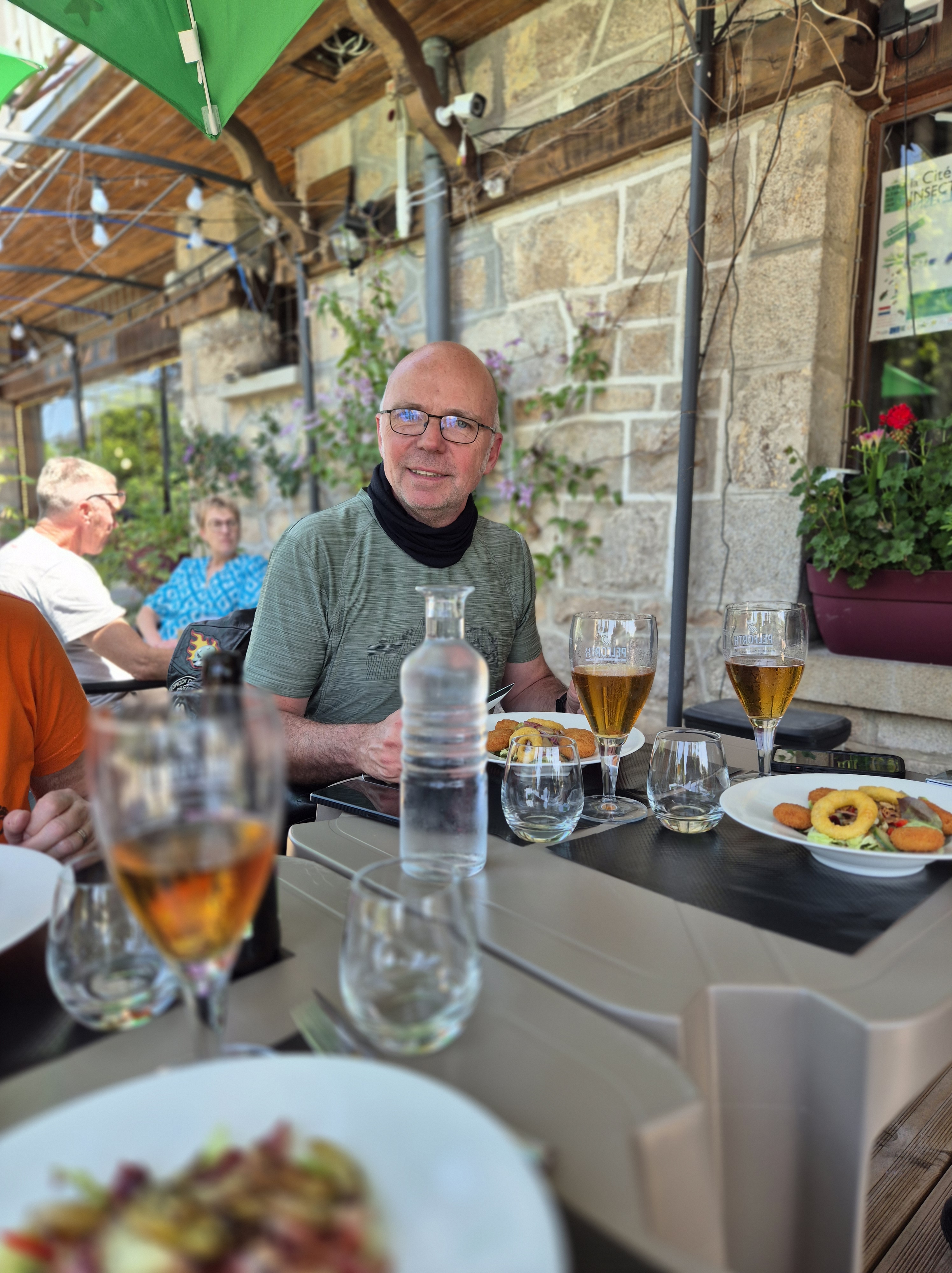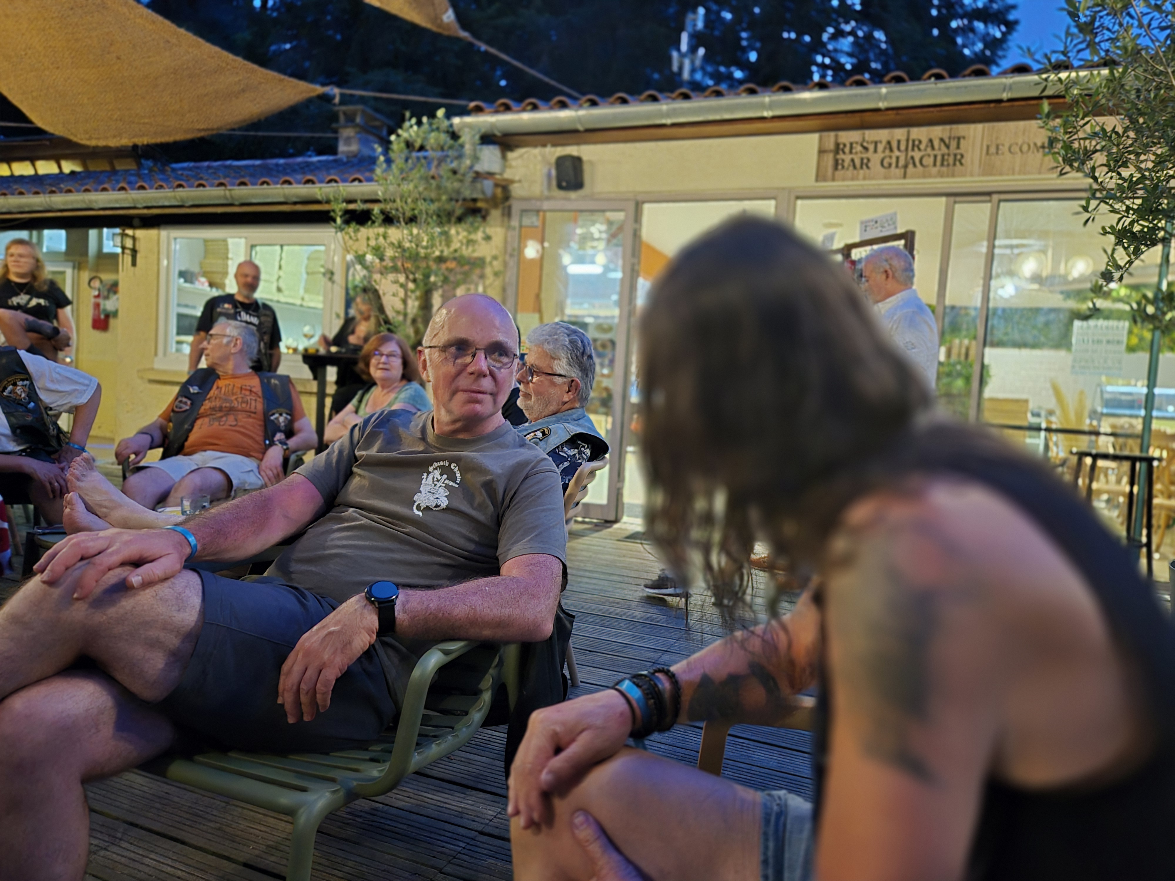 En attendant, Mike a sympathisé avec un couple franco-américain de retour des Salisses, qui prennent l’apéro plus loin, en terrasse de leur chambre. Ils se joindront ensuite à nous avec du bon vin ramené de leur séjour dans le sud.