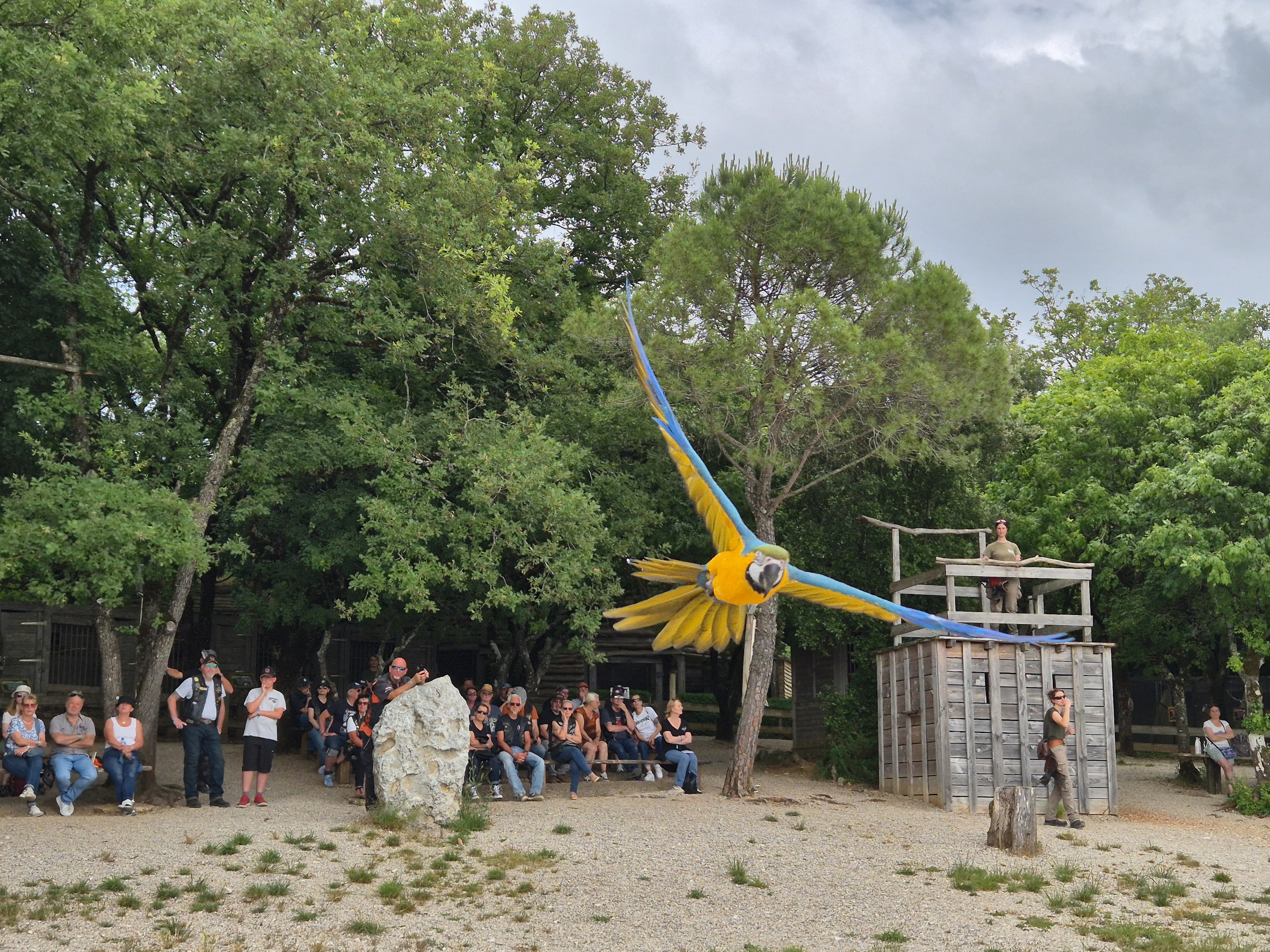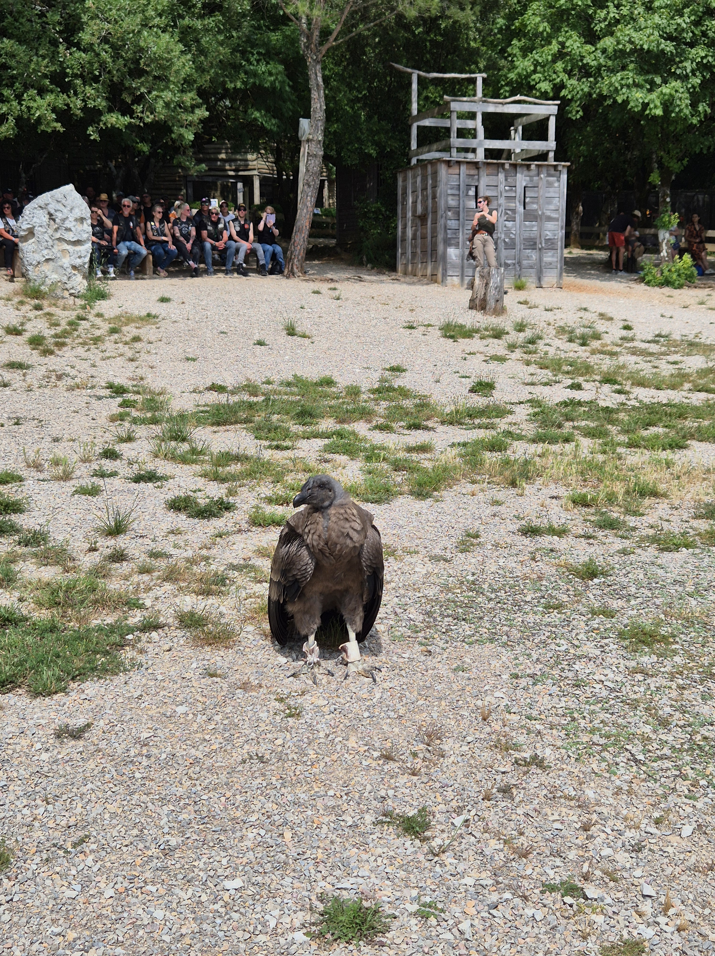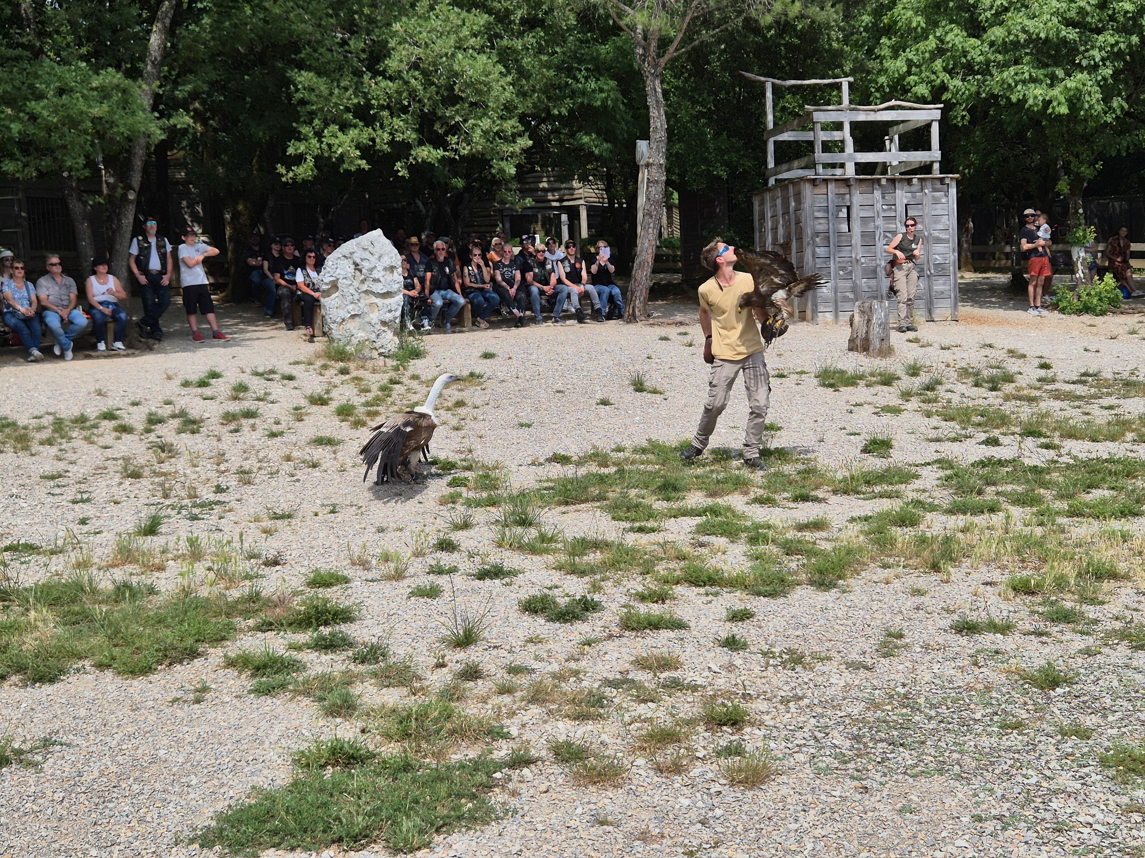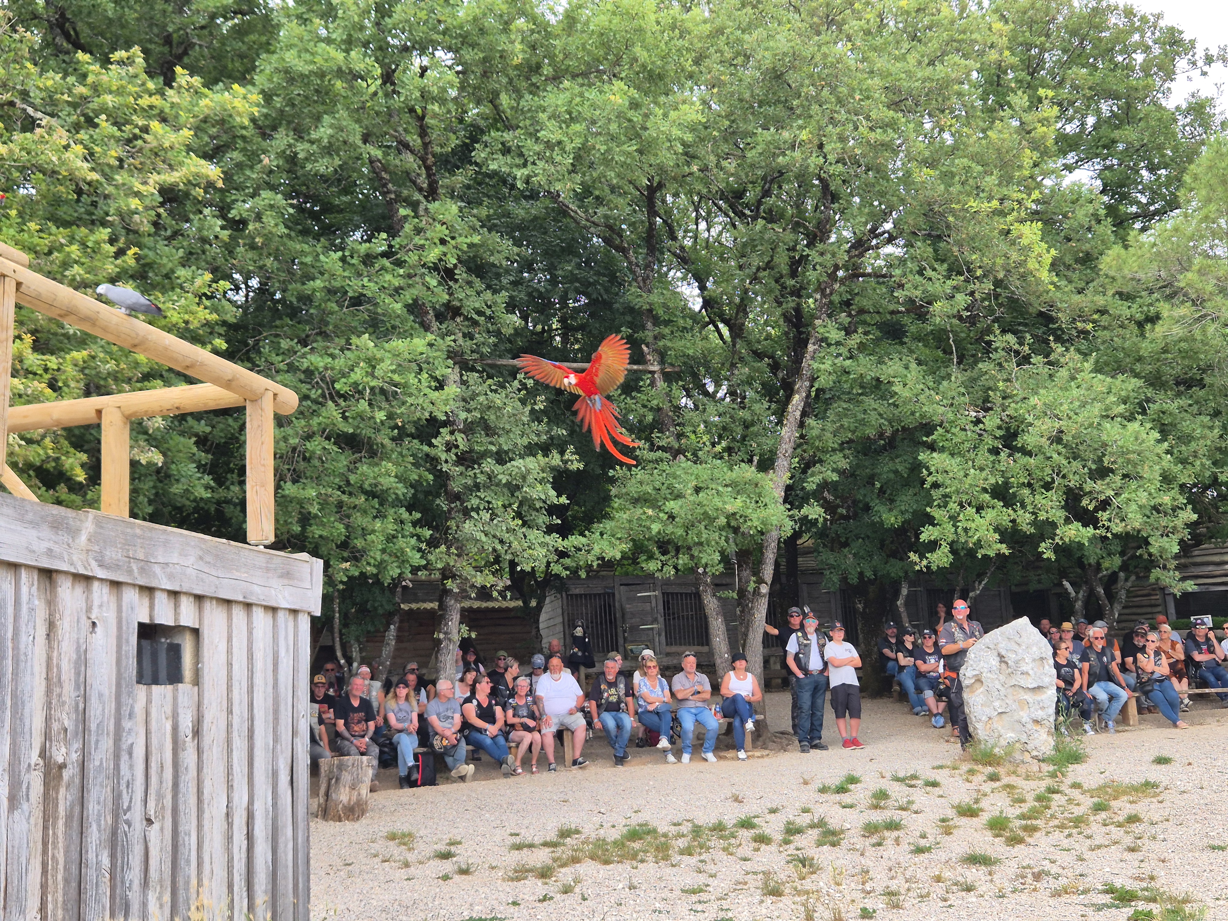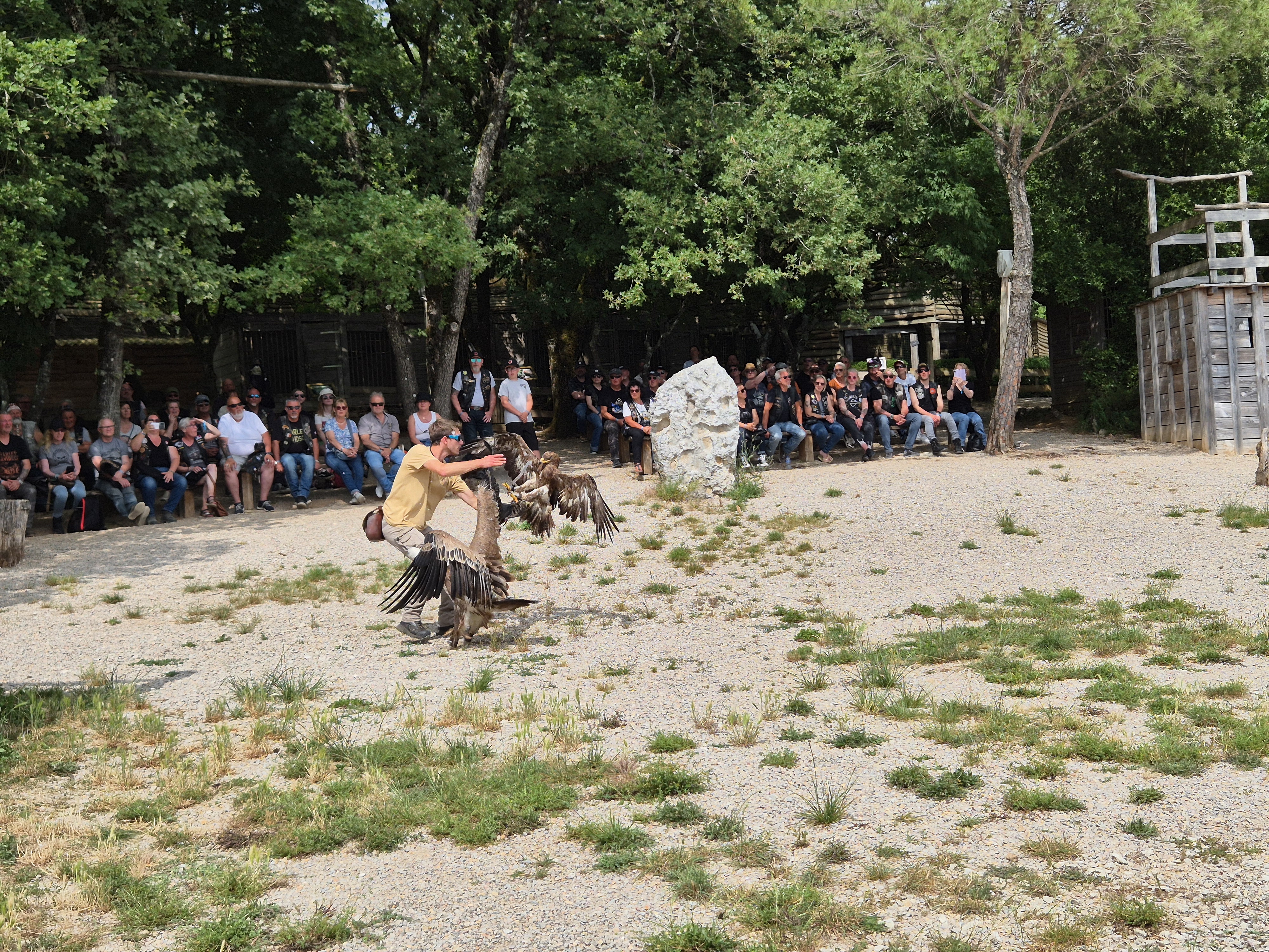 Nous nous retrouvons tous au Restaurant du Château pour le repas de midi et ensuite, très à son aise, nous dirigeons vers le Rocher aux Aigles où un spectacle impressionnant nous attend, mettant en scène des volatiles de tous genres, dont certains très exotiques.