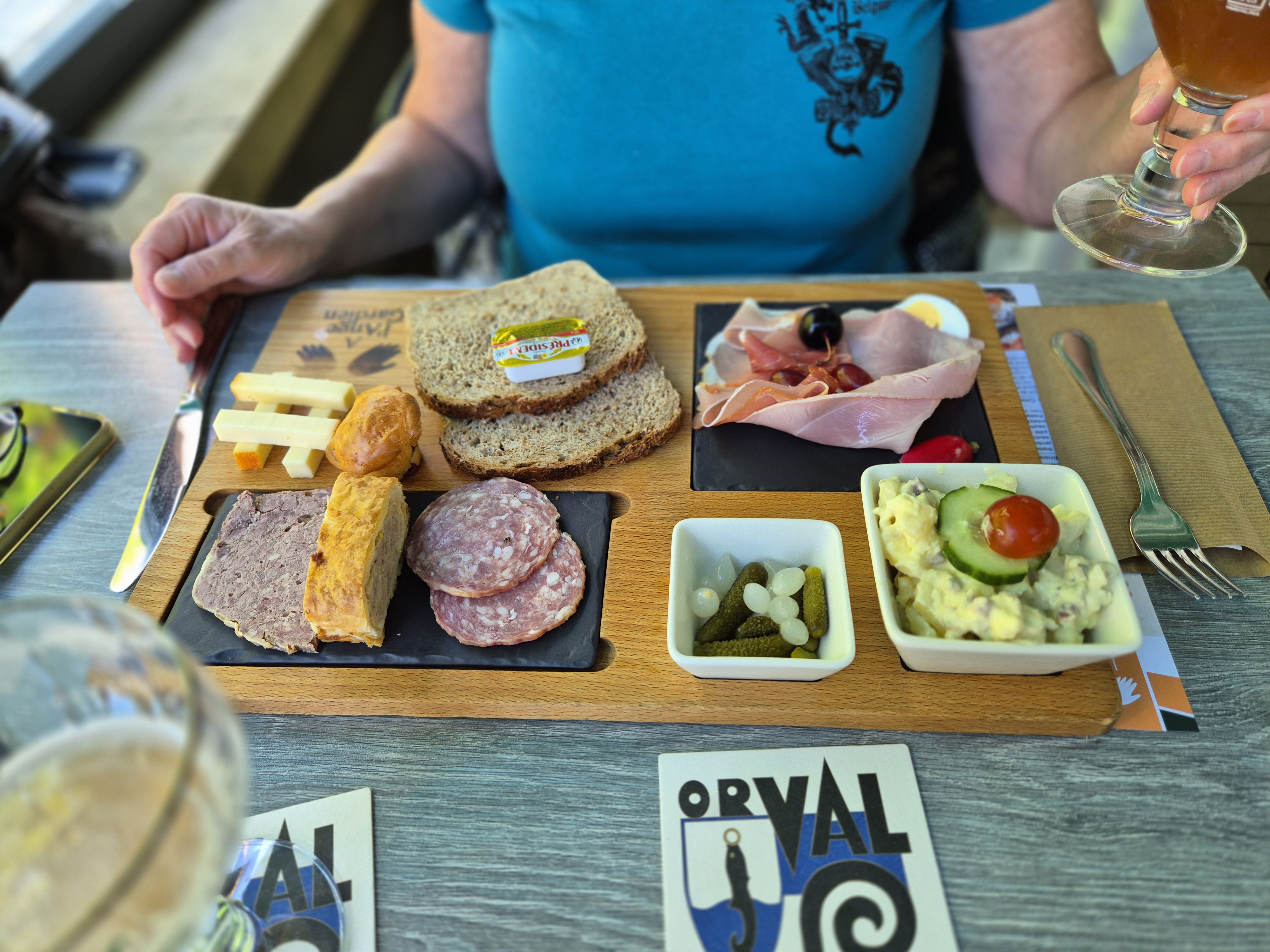 Le lendemain, 100% de nationales en attaquant par la route des grands crus, Dijon, Langres, Domrémy-La-Pucelle, Verdun, … lorsque, me dirigeant vers Sedan avec ma réserve allumée, je reçus une illumination sous forme de plaque « Florenville ». Le souvenir de mes anciennes terres me revint instantanément et je pris la route d’Orval pour nous y restaurer en dégustant le doux breuvage exclusif local, l’Orval verte, ou « petite Orval », boisson des moines mais servie uniquement à l’Auberge de l’Ange Gardien.